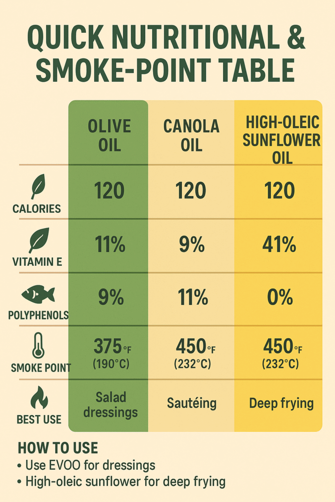 | Feature | Olive Oil (EVOO) | Canola Oil | Sunflower Oil (High Oleic) |